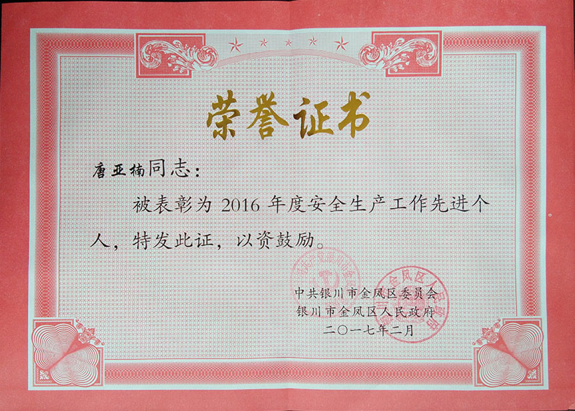唐亞楠總經(jīng)理榮獲“2016年度安全生產(chǎn)工作先進(jìn)個(gè)人”榮譽(yù)稱(chēng)號(hào)
