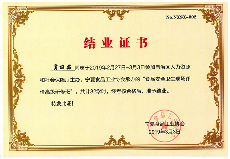 寧夏食品安全協(xié)會培訓結(jié)業(yè)考核證書