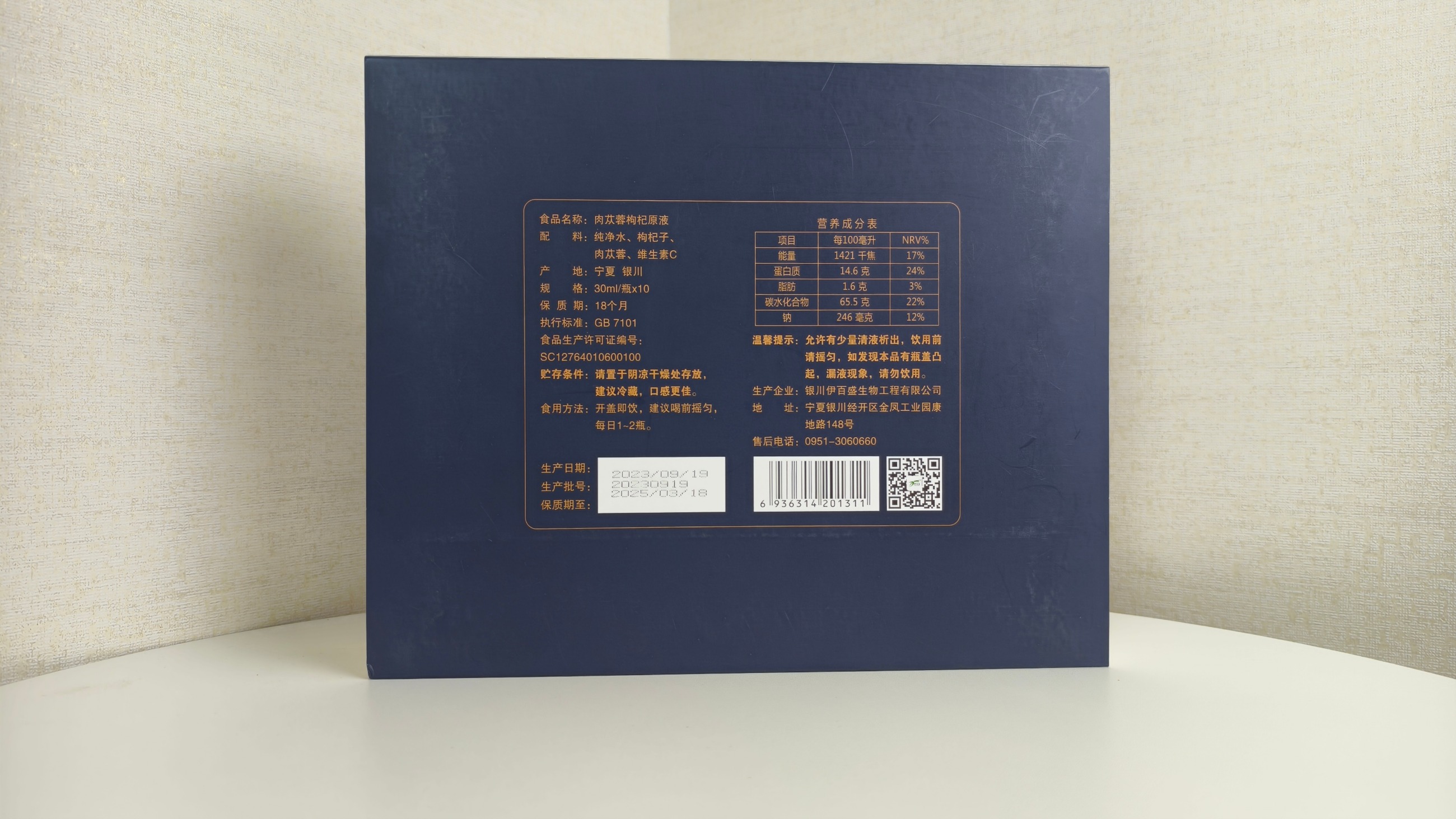 【配料】純凈水、枸杞子、肉蓯蓉(帶鱗葉的肉質莖)