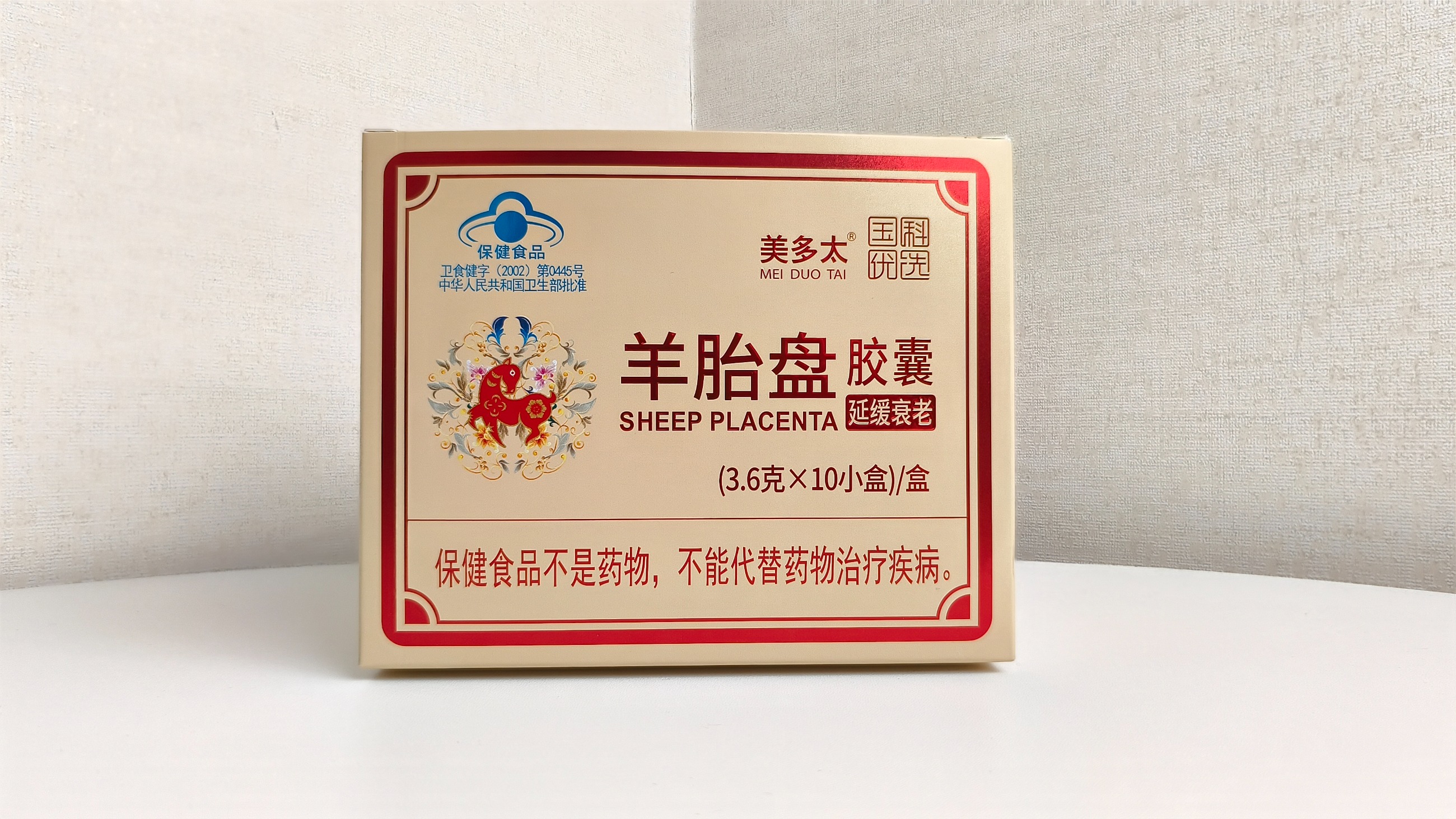 本品是以羊胎盤、淫羊藿、菊花、紅花為主要原料制成的保健食品,經功能試驗證明,具有延緩衰老的保健功能【主要原料】羊胎盤、淫羊藿、菊花、紅花、淀粉【保健功能】本品經動物實驗評價,具有延緩衰老的保健功能【適宜人群】中老年【不適宜人群】異體蛋白過敏者、少年兒童、孕產婦及月經過多者【食用方法及食量】早晚各1次,每次2粒;空腹,溫開水吞食【保質期】24個月【規格】300mg/種【貯藏方法】置陰涼干燥處【執行標準】JQ/ZRSW 0001S【批準文號】衛食健字 (2002)第0445號